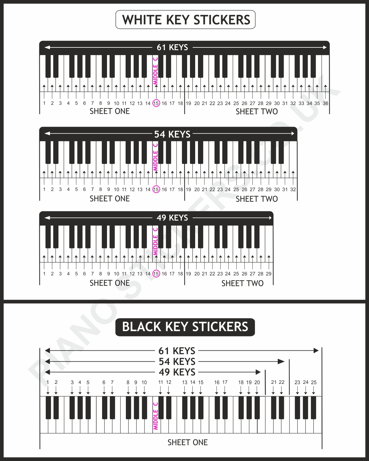 Fitting Guild Count how many black and white keys you have on your keyboard or piano and match it to our fitting guide. Ensure your hands are clean and the keys are grease and dust free before you apply the stickers. Placement Guild for 61 key set This is the fitting guild for any keyboard or piano up to 61 black and white keys. Placement Guild for 88 key set This is the fitting guild for any keyboard or piano up to 88 black and white keys.